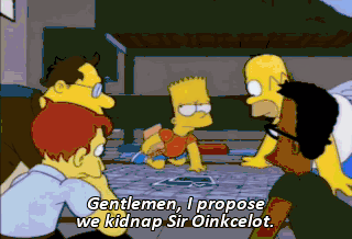 Gentlemen, I propose we kidnap Sir Oinkcelot. And then we roll him up in a carpet and throw him off a bridge!
