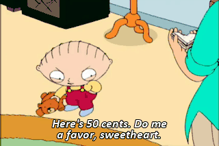 Here's 50 cents. Do me a favor, sweetheart. The next time you're out shopping, why don't you splurge on a tin of solid white albacore? Stewie, are you upset because you went wee-wee on the carpet?