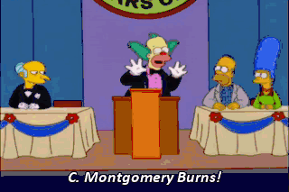 C. Montgomery Burns! I stand here to expose the criminal ineptitude... of Homer J. Simpson. Again and again, he's brought this town to the brink of annihilation. Why are you laughing?
