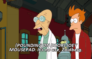 (POUNDING ON DOOR) JOEY MOUSEPAD: It's no use, Zoidberg. We're, like, 85% sure you're in there! Where is that rat? DR. ZOIDBERG: Zoidberg's not here.