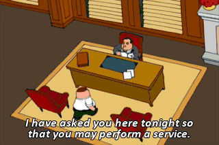 I have asked you here tonight so that you may perform a service. Ha, ha. W-What are you gonna make me do? Whack a guy? Off a guy? Whack-off a guy? 'Cause I'm marrieD. Silence!