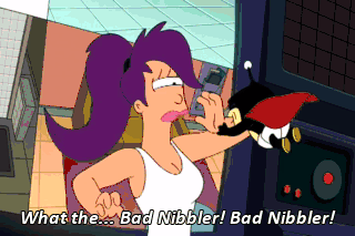 What the... Bad Nibbler! Bad Nibbler! What're you doing, pooper doodle? It's me, Leela! (SCREAMING) (CONTINUES SCREAMING)