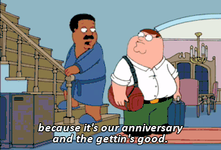 because it's our anniversary and the gettin's good. Ow! Ow! Ow! Ow! Ow! Ow! Ow! Ow! When is it gonna be my turn? Ow! Ow! Ow! Ow! Peter, You are welcome to stay with us as long as you like.