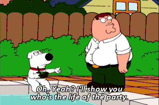 Oh, Yeah? I'll show you who's the life of the party. Hey, look! I fell in the pool with my clothes on! How hilarious is that? That is so Peter Griffin. Huh? Guys? Huh? Guys?