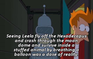 Seeing Leela fly off the Hexadecapus and crash through the moon dome and survive inside a stuffed animal by breathing a balloon was a dose of reality.