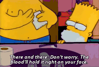 There and there. Don't worry. The blood'll hold it right on your face. And now, some aftershave. Ooh ! Ahh ! Eee ! Son of a-- Oh ! Eee ! And that's how we shave.