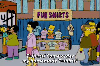 T-shirts! Come order my homemade T-shirts! My mom thinks they're good! Y'all ready for this? (UPBEAT MUSIC PLAYING) Hey! Hey, hey! Krusty Show T-shirts are made for kids by kids!