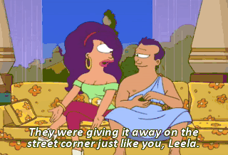 They were giving it away on the street corner just like you, Leela. Too bad they weren't giving away the three things you actually need-- mouthwash, a back wax, and stain-proof underwear.
