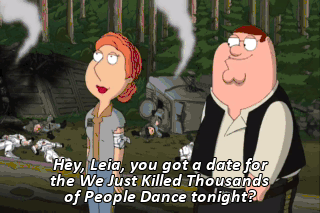 Hey, Leia, you got a date for the We Just Killed Thousands of People Dance tonight? No. You do now. Pick you up at 7:00. And save Yub Nub for me. Come to think of it, you can shave your yub nub for me, too!