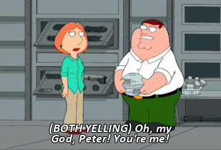 (BOTH YELLING) Oh, my God, Peter! You're me! Holy crap! Sweet! (CHUCKLING) (HUMMING) Squeeze, squeeze.