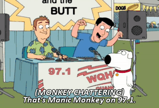 (MONKEY CHATTERING) That's Manic Monkey on 97.1. WOMAN: Manic Monkey, 97.1. MAN: Cool weekends in the morning. MAN 2: All weekend long. Weenie and the Butt. In the morning. In the morning. - On the radio. - FM.