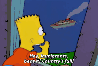Hey, immigrants, beat it! Country's full! Okay, folks. You heard the lady. Back into the hold. We'll try Canada.