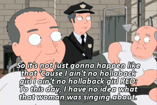 So it's not just gonna happen like that 'Cause I ain't no hollaback girl I ain't no hollaback girl RED: To this day, I have no idea what that woman was singing about.