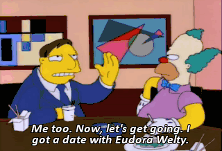 Me too. Now, let's get going. I got a date with Eudora Welty.