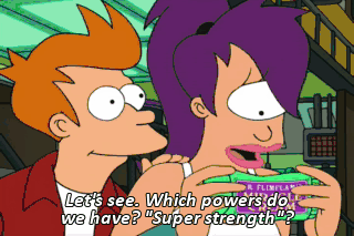 Let's see. Which powers do we have? "Super strength"? Yep. Uh-huh. "Lickety speed"? Check. Yes, sir. "Ability to command the loyalty of sea creatures"? Hey, Zoidberg, get in here! Screw you!