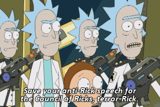 Save your anti-Rick speech for the Council of Ricks, terror-Rick. Hey, save your Rick rules for the sheep-Ricks, Rick-pig. - Fuck me, pal. - Fuck you? No, no, no, no, no. Fuck me.