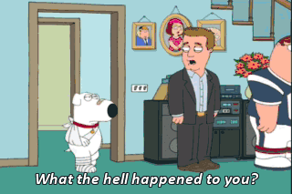 What the hell happened to you? I fell down the stairs. Oh, you should be more careful.