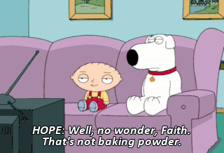 HOPE: Well, no wonder, Faith. That's not baking powder. It's sneezing powder. (LAUGHING) FAITH: But, f already brought a whole batch to the church bake sale. (LAUGHING)