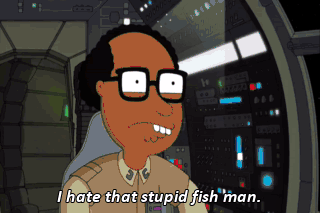 I hate that stupid fish man. I say when we're done with this, we go over there and fry him up in a skillet.