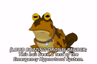 (LOUD BUZZING DRONE) BENDER: This has been a test of the Emergency Hypnotoad System. Had this been an actual hypnosis, you would go limp and watch whatever crap comes on next. Coming up next, Futurama!