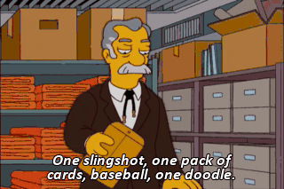 One slingshot, one pack of cards, baseball, one doodle. (READING) One harmonica. Perfect mood setter for the end of your freedom.