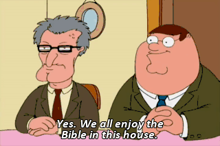 Yes. We all enjoy the Bible in this house. Really? What's your favorite book of the Bible? Um, uh... That one where Jesus swallows the puzzle piece and the man in the big yellow hat has to take him to the hospital.