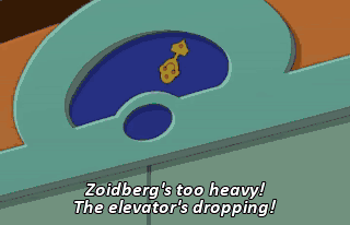 Zoidberg's too heavy! The elevator's dropping! Change of plan! We'll have to leave through the main exit! Everybody say "fresh shrimp!"