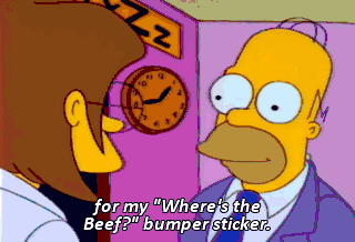 for my "Where's the Beef?" bumper sticker. "Where's the Beef?" Uh, we'd like the desk back, Mr. Simpson. Huh? Oh.