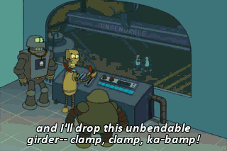 and I'll drop this unbendable girder-- clamp, clamp, ka-bamp! Remember, only kill the one with the beard. That other filthy scab, we got nothin' against.
