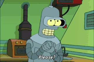 Please? Ooh, is it "please"? Nope. Hmm. Words I never say. Oh. I know. "Thanks." Bender, stop trying to destroy the world. Wait, wait, wait, wait. Is it "sorry"? No. "Funderful"?