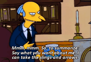 Mmm, mmm. So, to summarize: Say what you want about me. I can take the slings and arrows.