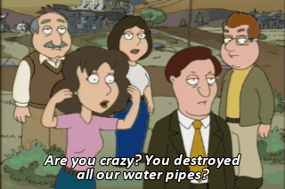 Are you crazy? You destroyed all our water pipes? We don't need guns! We need food and water! I have a canker sore on my lip!