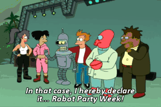 In that case, I hereby declare it... Robot Party Week! All right, baby! Fiesta ha ha me MinD on fire me soul on fire feelin' hot, hot, hot Yeah, baby! Yeah!