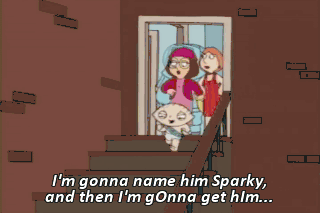 I'm gonna name him Sparky, and then I'm gOnna get hIm... What the hell? Peter, if you want to stay here, that's fine. But we're going to the party. Kids! Honey, are you pregnant? No. Ahh!