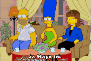 So, Marge, tell. What's it like kissing a man with a mouth full of metal? My boyfriend has a metal tongue stud. Who cares what's on his tongue, long as he's a stud where it counts. I'm talkin' downtown.