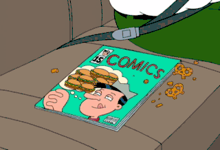 (PETER) Look at all those hamburgers. You can't eat all those hamburgers, you stupid fellow! Oh, jeez.