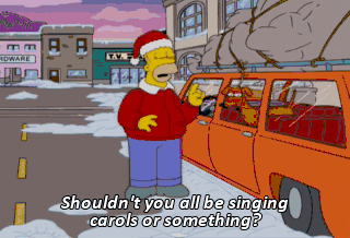 Shouldn't you all be singing carols or something? (GROANING) Stop! Friends, what Homer did was wrong but I've been thinking. Maybe I was just as wrong to give you those gifts.