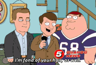 I'm fond of your hair, as well. I'm standing here with Tom Brady and his newest teammate, Peter Griffin. Hey, Ma! Check it out! I'm married to a pro athlete! What do you think of that? (LAUGHING)