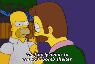 My family needs to use your bomb shelter. Homer! I kinda figured this might happen. So I built the shelter big enough for both our families. No deal. Out. Get in the shelter, Homer.