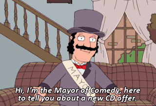 Hi, I'm the Mayor of Comedy, here to tell you about a new CD offer. Sitcom Punch Lines of the 80's. Including such gems as "I think it's time for plan 'B,'" "Smooth move, Ex-Lax" and "That went well."