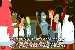(SCATTING) That's because the doomsday device I shoved all up in you puts out 50 gigawatts. That's 10 times your recommended... Who are you, my warranty? (CHUCKLES) That was a good... (LAUGHING) (POWER SURGING) Huh?