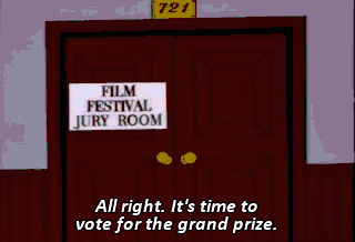 All right. It's time to vote for the grand prize. I vote for Barney Gumble's sensitive, yet unfortunately titled film, Pukahontas. Second!