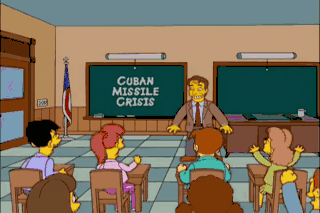 And so President Kennedy says to Khrushchev, "Well, enough jawin'. Reach for it, pilgrim." And the missiles are, like, "Oh, praise Jesus! Can I hear an amen?" Hey, Macarena!