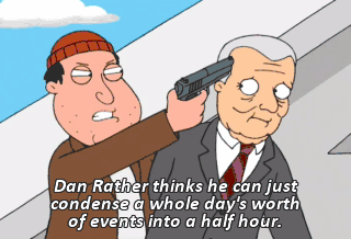 Dan Rather thinks he can just condense a whole day's worth of events into a half hour.