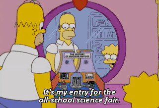 It shows the history of nuclear physics from Marie Curie's laboratory to a scale model of the first nuclear reactor.