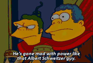 He's gone mad with power like that Albert Schweitzer guy. Whee! Whee! Oh, for the love of God! Somebody get the jaws of life!