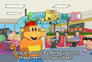 (DISCO MUSIC PLAYING) Watch the screen, not your feet. Bill, shut up, I got it. MAN ON PA: Number 32. Oh, no, our pizza's ready. Tag out, man, tag out.
