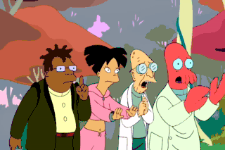 (BELCHES) Bender! Shut the hell up! (POWER SURGING) Bender! Stop shutting the hell up! Right. Leela's back, as if I care.