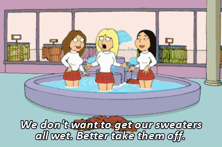 We don't want to get our sweaters all wet. Better take them off. Splash fight!