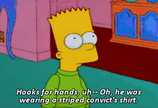 Hooks for hands, uh-- Oh, he was wearing a striped convict's shirt.